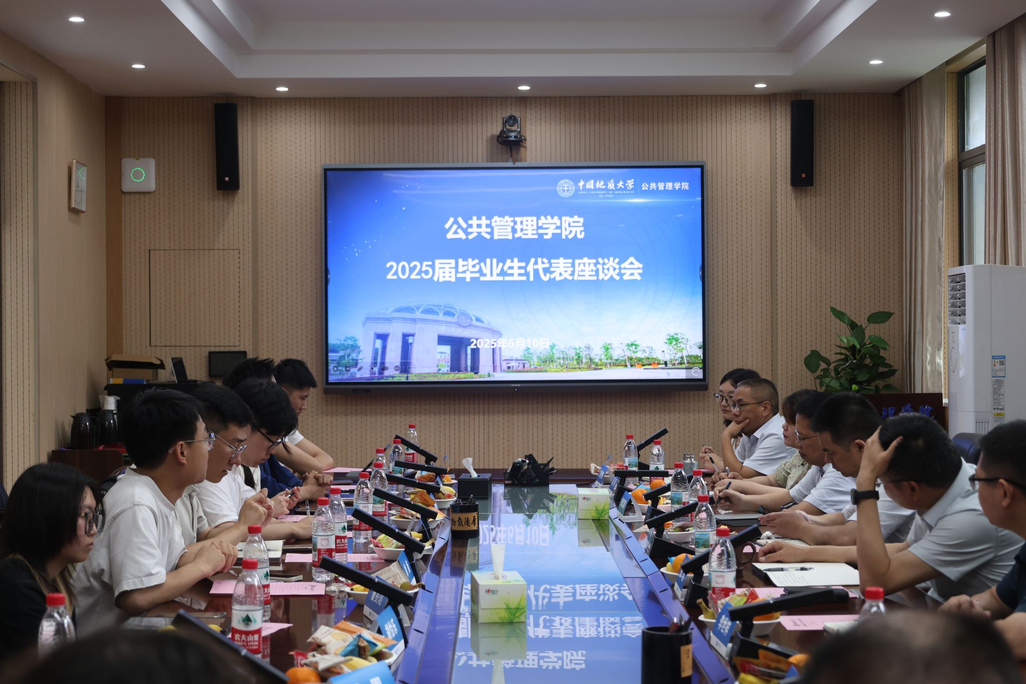 党委书记徐岩,院长龚健,党委副书记龚丽,副院长朱江洪、吕凌燕、王忠、李世祥,土地资源管理系主任方世明,公共行政系书记张光进,研究生教务秘书杨朝琦,毕业生辅导员李姝慧、王青涛及本硕博各专业毕业生代表共聚一堂,共同回顾成长历程,畅谈未来愿景,在温情与期许中为毕业生送上“最后一课”。座谈会由萝莉社