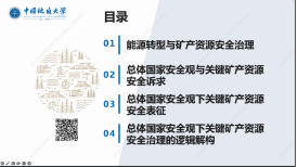 周娜副教授作题为《总体国家安全观下关键矿产资源安全治理的国家逻辑》的主旨报告。周娜副教授认为新能源、新技术和新材料等新兴产业的发展,使关键矿产资源需求激增,已成为全球主要国家资源安全治理的焦点。在梳理已有矿产资源安全评价理论、全球价值链理论和国家资源治理理论的基础上,周娜副教授从总体国家安全观的内涵出发,以锂资源为例剖析了总体国家安全观下关键矿产资源安全表征,并从治理主体、治理目标、治理方式三个维度解构了总体国家安全观下关键矿产资源安全的治理逻辑。