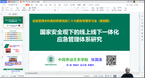 副院长任国友教授作题为《国家安全观统领下的线上线下一体化应急管理体系构建研究》的主旨报告。任国友教授从我国现行应急管理体系的主要弊端与关键问题入手,依据应急管理四阶段理论,提出应急管理体系线上线下一体化设计原理,构建“应急文化、应急资源、应急运作、应急恢复和应急组织”为核心的应急管理“4+1”模型。在此基础上,任国友教授以雄安新区为例,从线上线下2个维度设计并构建了雄安新区线上线下一体化应急管理体系,并展望了线上线下一体化应急管理体系在国家应急管理体系现代化的改革实践和社区应急管理体系建设中的推广前景。