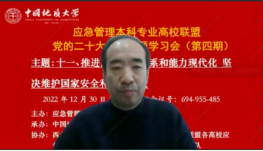 )院长/应急管理本科专业高校联盟理事长雷晓康教授分别发表嘉宾致辞。李明华局长表示应急管理本科专业高校联盟党的二十大报告专题学习会(第四期)是认真贯彻落实党中央决策部署的重要举措,是践行党的二十大报告精神在应急管理实践工作的具体行动,体现了高度的政治责任感和使命感。雷晓康教授表示党的二十大报告为各行各业的工作指明了未来的方向,在党的二十大报告精神指引下,应急管理本科专业高校联盟深入学习、狠抓实干、久久为功,争取出一批应急管理相关研究成果。