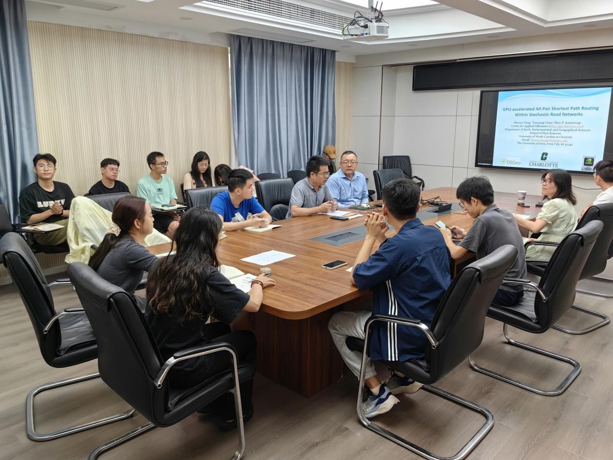 交流讨论环节,萝莉社 师生与唐文武教授就最短路径算法模型的构建、GPU在地理建模与复杂计算中的应用,以及人工智能大模型在学习中的应用等问题进行热烈的讨论与交流。现场学术气氛浓厚,师生们收获颇丰。