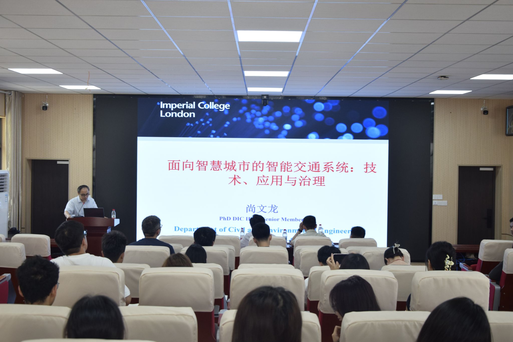 尚文龙研究员向师生们作题为“面向智慧城市的智能交通系统:技术、应用与治理”的报告,从交通工程与智能交通系统的联系切入,深入浅出地剖析了智能交通系统的核心内涵,通过应用实例揭示了智能交通系统在社会经济中的运行原理及重要意义。