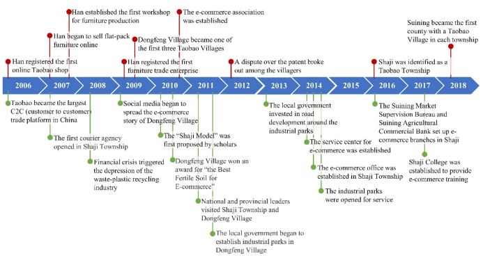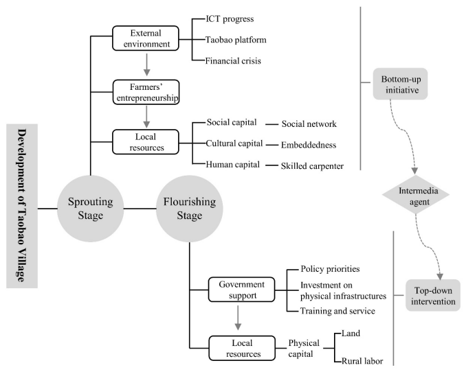 胡守庚教授与臧玉珠副教授在Journal of rural studies 合作发表研究论文“Entrepreneurship and the formation mechanism of Taobao Villages: Implications for sustainable development in rural area”。该文以江苏徐州睢宁县沙集镇东风村为例,通过田野调查,追溯了典型淘宝村的产生与发展过程,探究了淘宝村的形成机制,揭示了草根创业、乡村社会网络及政府参与在淘宝村发展过程中的关键作用,总结了淘宝村的新内生式发展模式(neo-endogenous rural development),从而为乡村地区可持续发展提供经验借鉴。