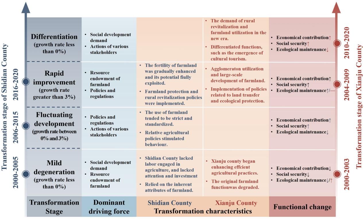 文章指出,耕地多功能利用是保障粮食安全、社会经济稳定和生态可持续发展的关键,研究耕地多功能利用特征及其驱动机制对促进耕地高效利用、实现人地和谐发展具有重要意义。论文以中国东部发达地区仙居县和西部欠发达地区施甸县为例,采用TOPSIS模型计算综合功能得分,比较分析了2000-2020年两县耕地利用功能转型特征和驱动机制,提出了耕地利用功能转变的发展策略。研究发现,两县耕地多功能转化存在显著的异质性。施甸县经历了轻度退化、波动发展和快速改善三个转型阶段,仙居县经历了轻度退化、快速改善和差异化发展阶段。社会发展需求、资源禀赋制约、多元主体行为以及政策制度实施共同推动了耕地利用方式的转变。通过推动开发资源潜力,可以缩小两地区发展差距。本研究为缩小区域耕地效益差异、促进耕地高效利用提供了理论与实践支持,为区域协同均衡发展提供了科学参考。