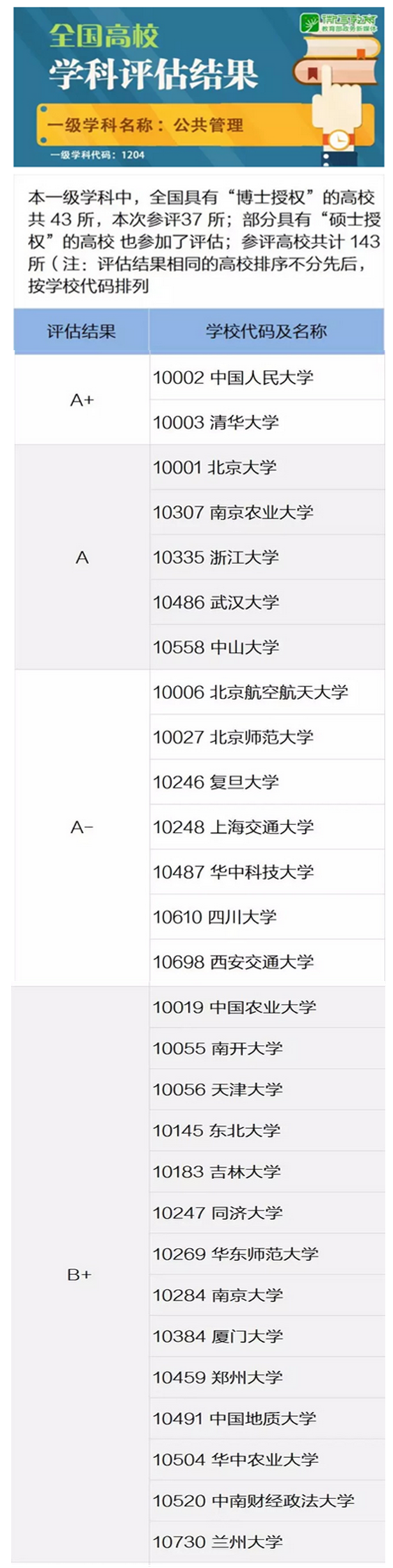 2017年12月28日,教育部学位与研究生教育发展中心公布了全国第四轮学科评估的结果。全国共有143所高校参加了本轮公共管理一级学科评估,萝莉社