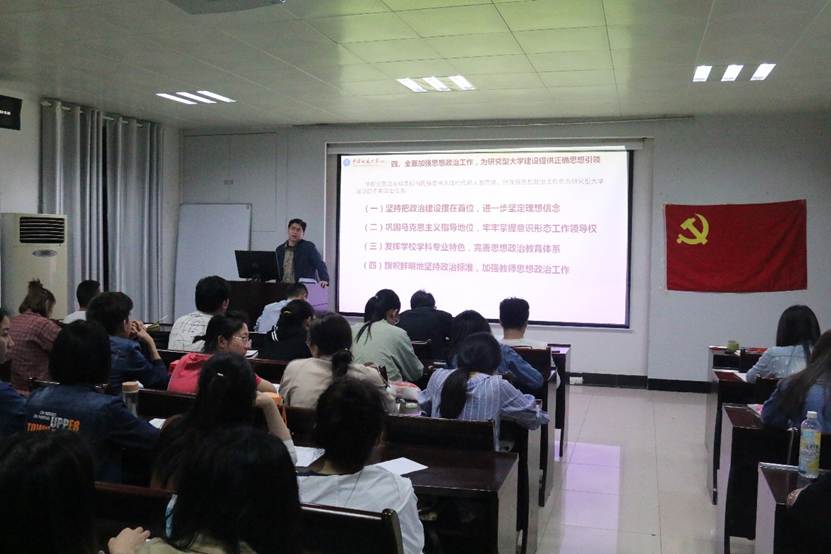 最后,他要求全体党员认真学习学校十二次党代会精神,做好“宣讲者”;深化对学校“地大梦”的认识和理解,积极投身学校“双一流”建设,做好“参与者”。