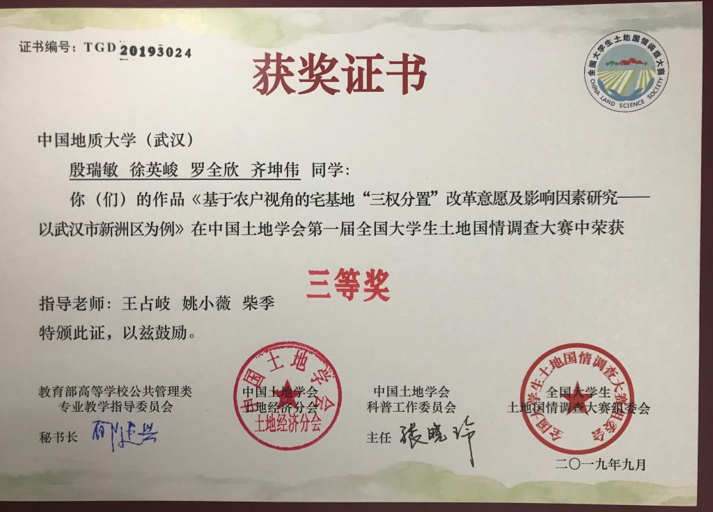 王占岐、姚小薇、柴季三位老师指导、土地资源管理专业本科生殷瑞敏、徐英峻、罗全欣、齐坤伟等同学组成的“追本溯源”团队完成的作品《基于农户视角的宅基地“三权分置”改革意愿及影响因素研究——以武汉市新洲区为例》成功晋级决赛,并荣获大赛三等奖。