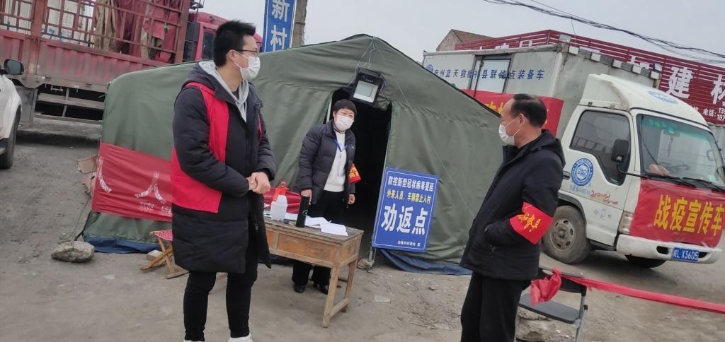 预备党员陈泽贤在村口执勤点负责人员出入登记