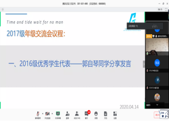 整个线上会议历时两个多小时,相信两位老师和学姐们的鼓励期待和希望寄语都留在了2017级同学们的心中。行百里者半九十,希望2017级的每一位同学在疫情防控特殊时期都能进一步认识识到大三学期的重要性,认澄清自己,明确目标,多方了解,只争朝夕,不断充实自己,让每一天过得有意义,在大三这个人生的重要转折期做出最适合自己的抉择,并为此付出最大的努力!