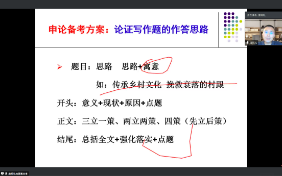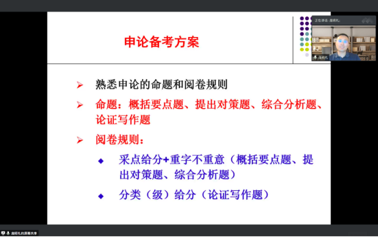 随后,庞教授结合自己在国家公考中的工作经历,依次对申论中的概括要点题、提出对策题、综合分析题、论证写作题的作答思路进行了细致的讲解。庞教授通过对阅卷规则的解读,让同学们了解到答卷的过程中掌握踩点给分、重字不重意、分类(级)论述的技巧。