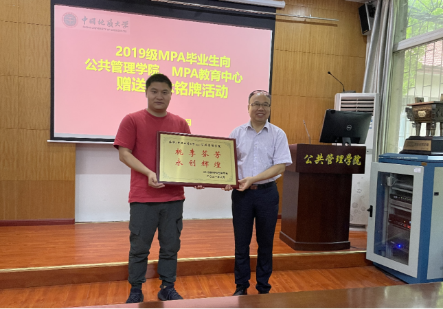 2019级MPA研究生代表范尧同学向MPA教育中心领导赠送了“饮水思源、师恩千秋”的牌匾。