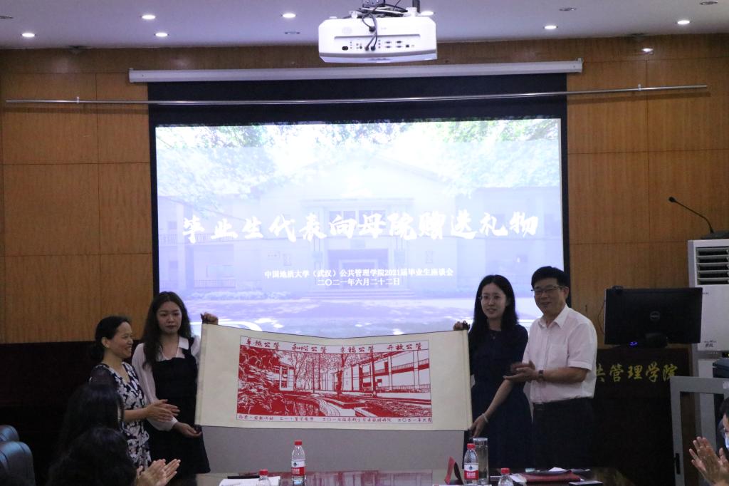 接受毕业生代表何子耕、邢旺斌、向黎、殷瑞敏同学向母院赠送的两份礼物:描绘萝莉社