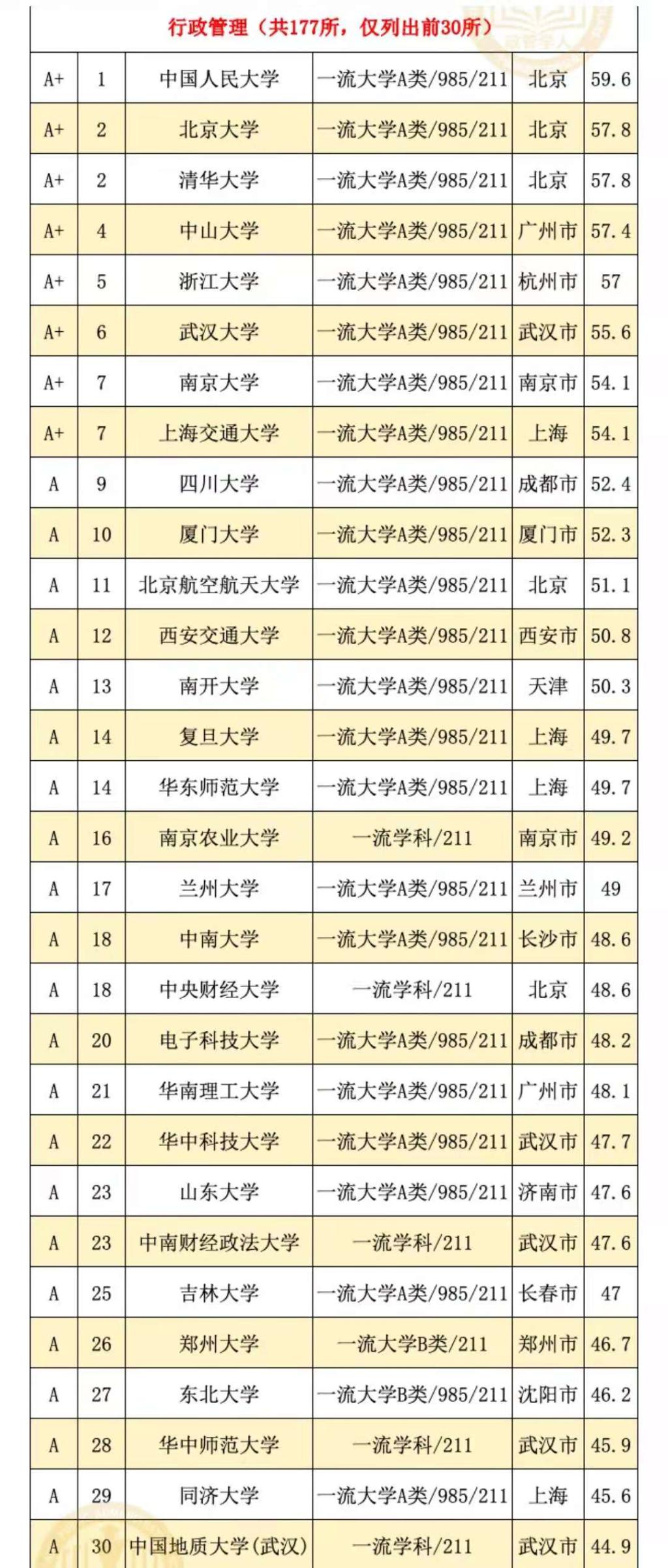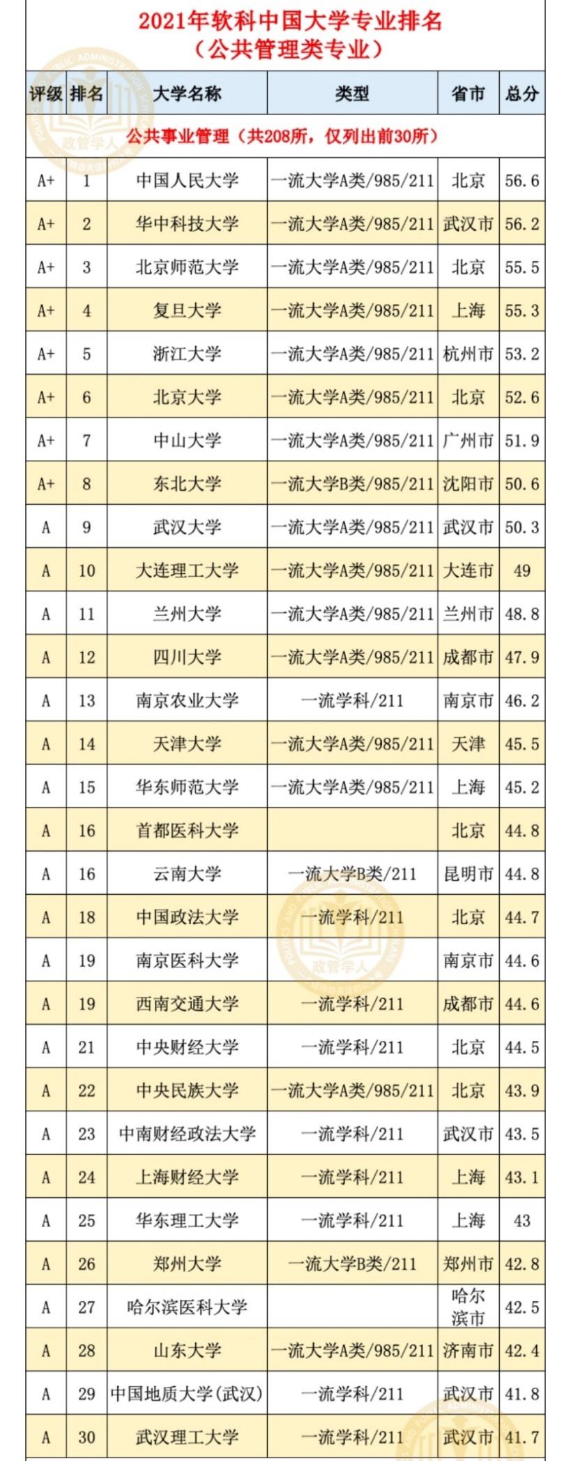 行政管理、公共事业管理专业获评A类专业。这是软科首次发布针对中国内地高校本科专业的排名,也是迄今为止覆盖专业数量最多、参评专业规模最大的中国大学本科专业排名。