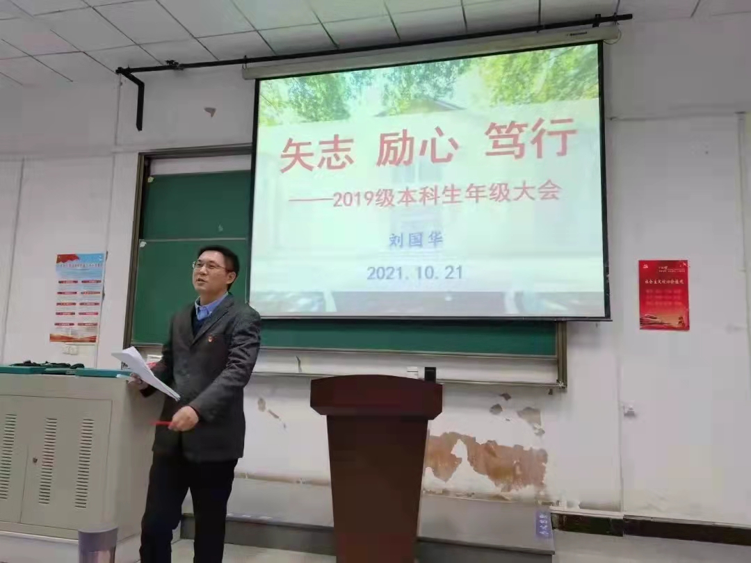 党委副书记兼2019级辅导员刘国华老师,朱悦、于嘉宁、索云龙、袁可怡四位成功考研保研的学长学姐以及2019级全体本科生参加此次大会。大会由院党委副书记刘国华老师主持。