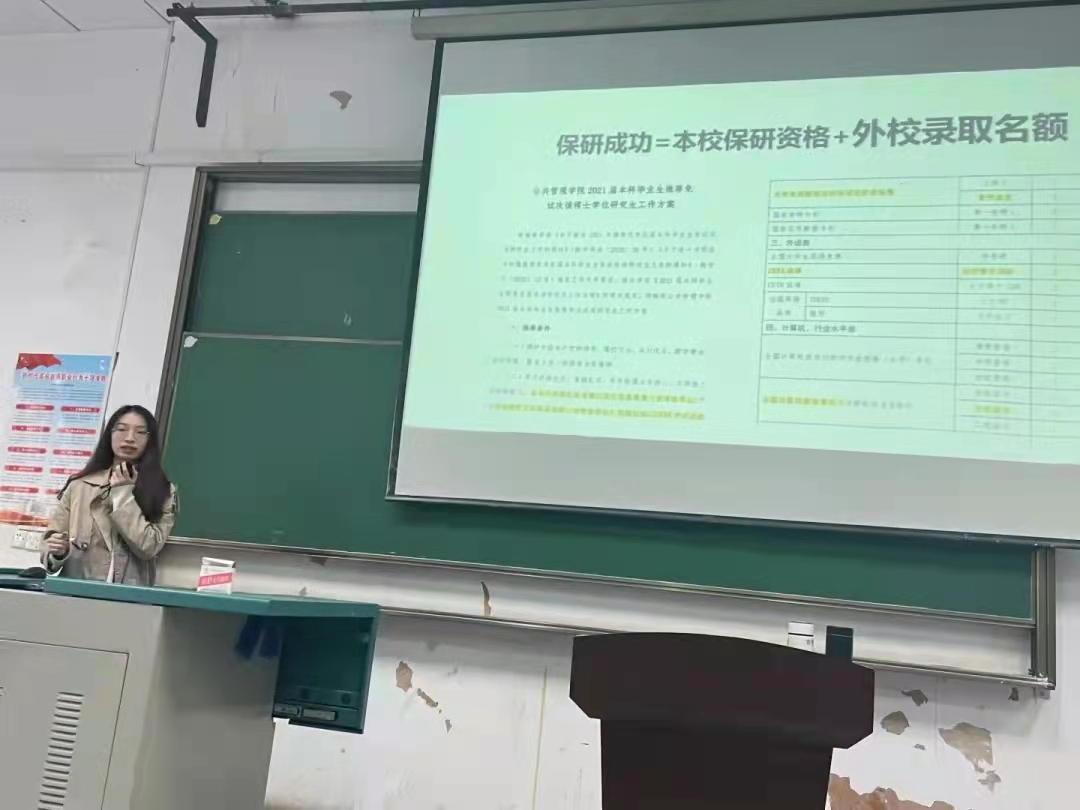 最后,172182行政管理专业袁可怡以前期蓄力、拉开序幕、夏令营、预推免/九推为主轴线分享了自己的保研经验。她说,保研是一场持久战,向大家重申了英语四六级、雅思托福以及英语口语的重要性,希望大家多参与此方面赛事,在各项大赛间锻炼自己;她在科研的方向寻找、论文发表等方面提出了自己的一些建议,分享了在保研进程中了解清楚自己底线和目标、信息收集和整理、提前准备系列个人材料、敢于尝试参加夏令营等方面内容。她认为,不要否定自己,继续收拾好心情努力前行,所有过往的一切都会塑造现在的你、将来的你。