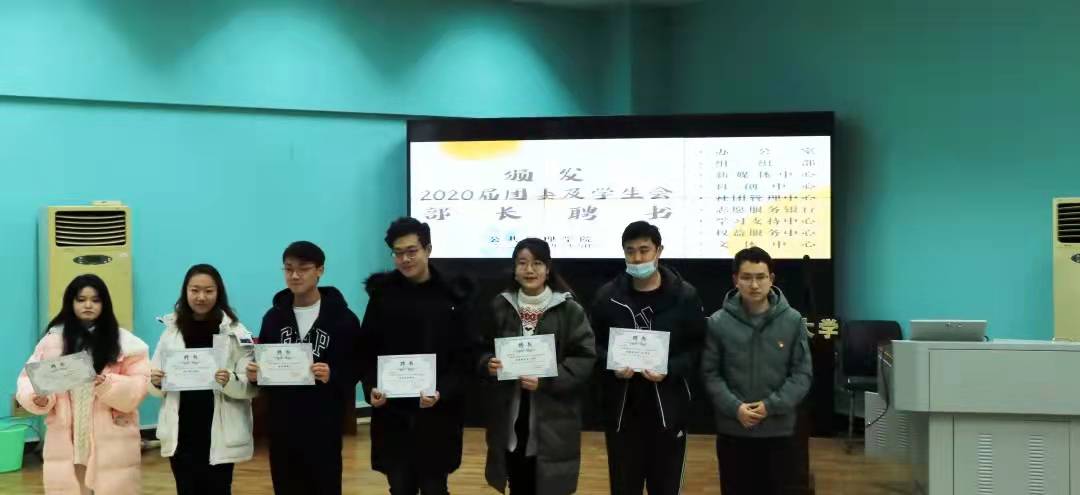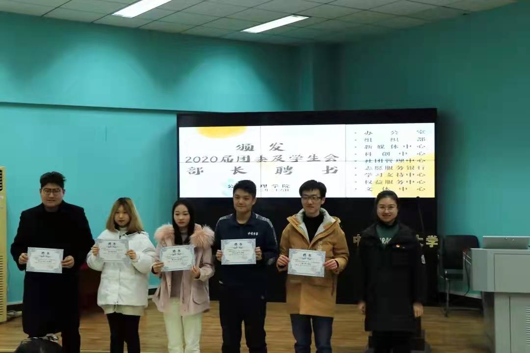活动第一项,党委副书记刘国华老师为2020届团委及学生会主席团成员颁发聘书,学工组王青涛老师、吴波老师、王欣雨老师依次为2020届各部门部长颁发聘书。