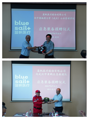 党委书记张宽裕分别接受了蓝帆医疗捐赠的AED除颤仪和全系列急救包。