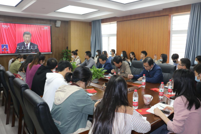 领导、学生党支部书记、团学骨干、教师代表、学生代表在227会议室集中组织收看、学习。各系以支部为单位组织收看,学生使用手机、电脑终端收看直播。