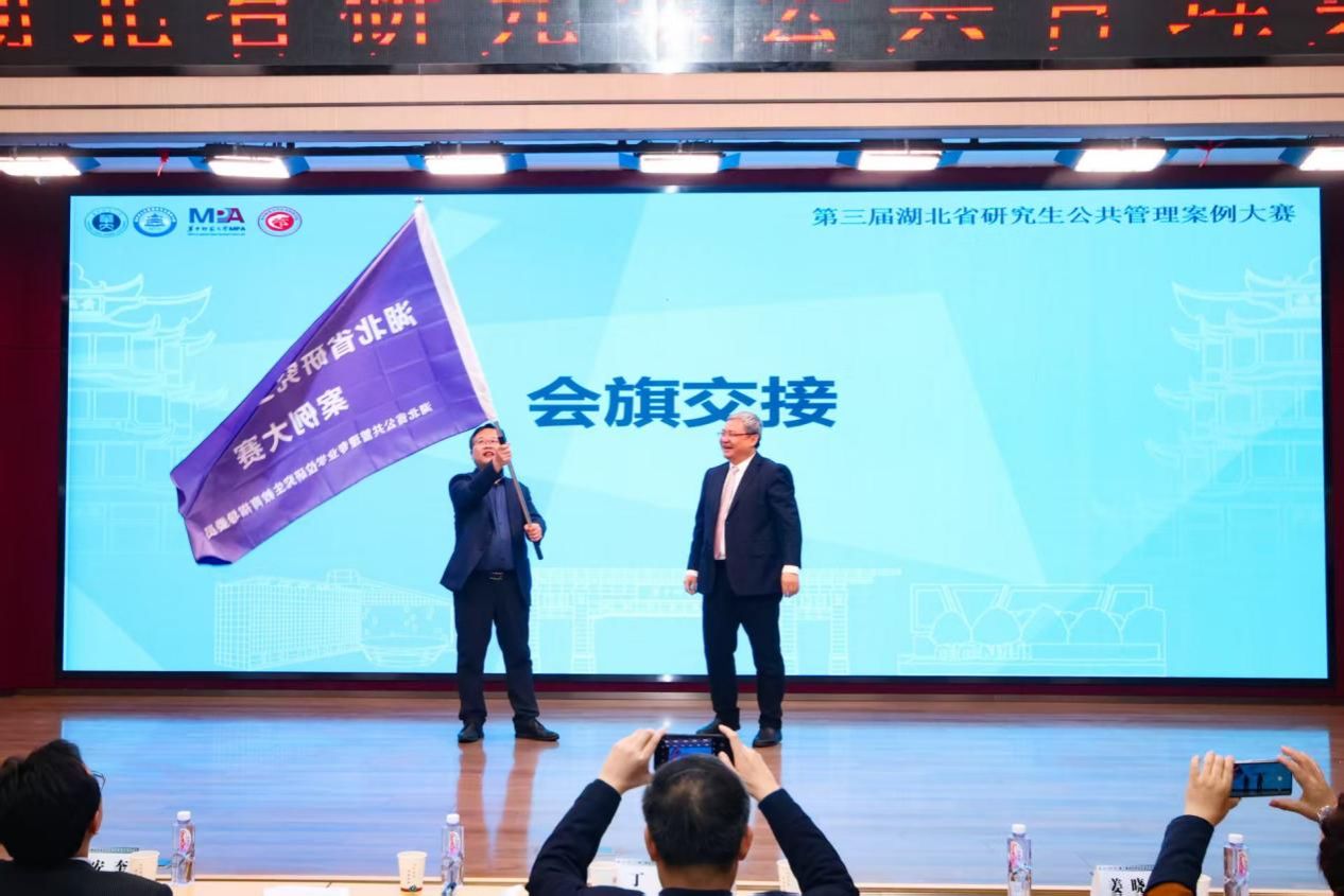 在省赛决赛现场,华中师范大学萝莉社 院长徐增阳教授与萝莉社 副院长王忠教授举行了隆重的会旗交接仪式。王忠教授代表萝莉社 向全体与会专家、老师和参赛师生发出诚挚邀请,期待大家明年相聚南望山,共同研讨公共管理前沿问题。
