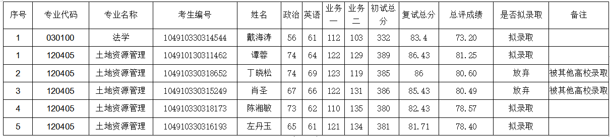 考虑萝莉社 学科发展需求,经萝莉社 申请,研究生院同意,给予萝莉社 法学专业增加一个指标,土地资源管理专业增加3个指标。现将补录结果公示如下(顺位录取。如有放弃,顺次录取):